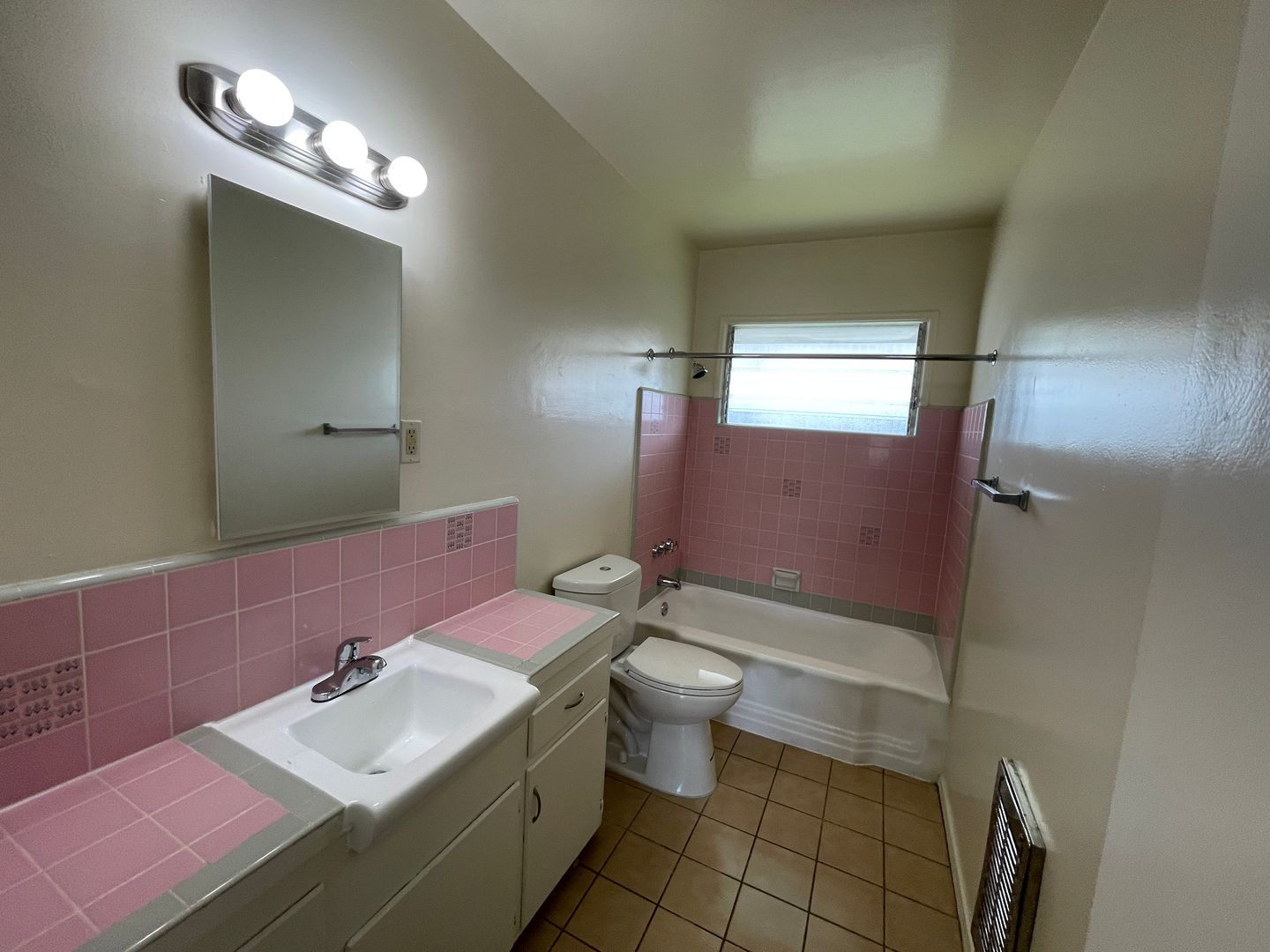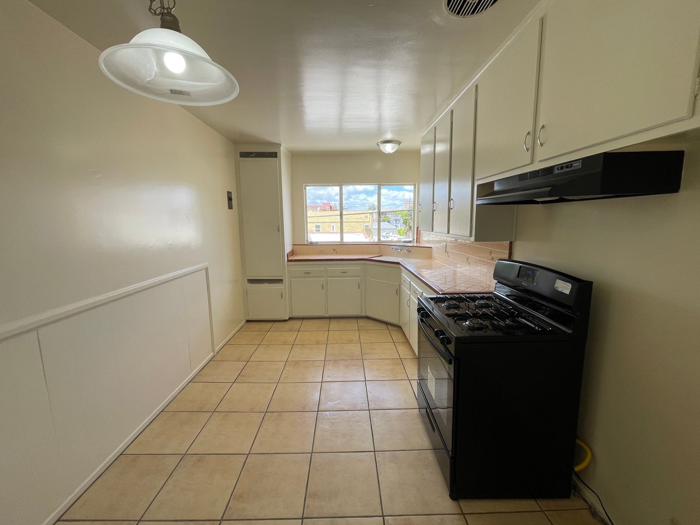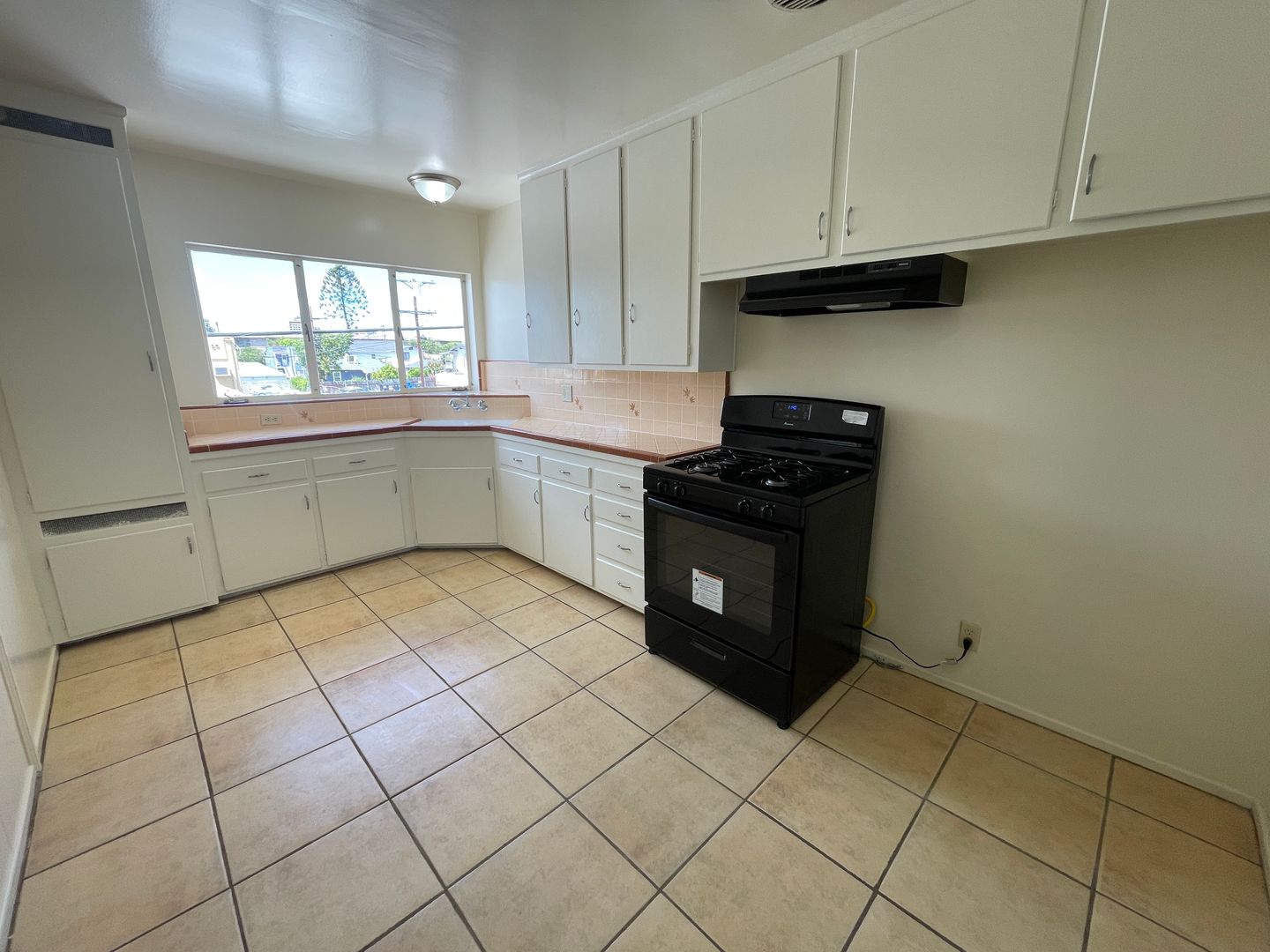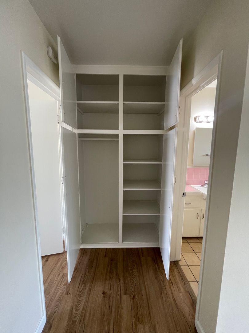 If you enjoy cooking take a look at this functional retro kitchen featuring white cabinets, black range, tile flooring, and a sunny window Classic pink-tiled bathroom with full bathtub/shower, vanity sink, and retro flair that feels straight out of a stylish 70s/80s magazine; Huge built-in linen/storage closet with multiple shelves, hanging rod, and upper cabinets — perfect for towels, linens, and all your extras