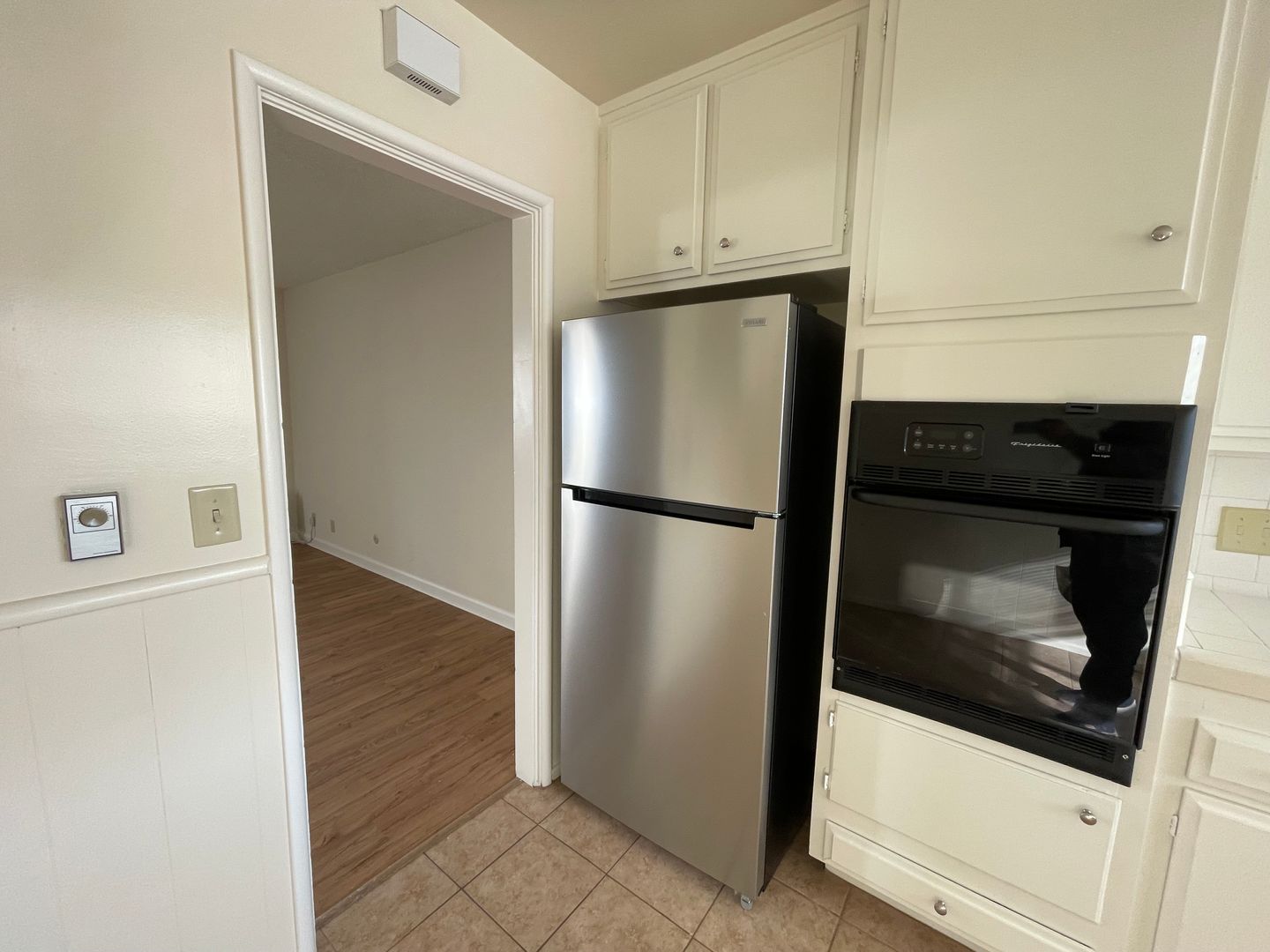 Enjoy a generous layout featuring large windows that flood the space with natural light, laminate flooring, and a cozy ambiance perfect for relaxation. A dedicated kitchen with vintage accents, including a gas oven/range, range hood, refrigerator, plenty of cabinetry, and a charming breakfast nook area for casual meals.